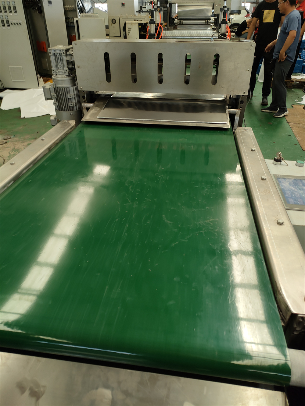 單工位1)上放卷安裝在輸送帶頂部;一個(gè)直徑71mm氣脹軸;放卷速度采用磁粉控制; 放卷裝置上安裝2)下放卷安裝與托架下; 一個(gè)直徑71mm氣脹軸; 放卷速度采用磁粉控制;下放卷架子與底座為螺絲連接;與輸送帶能同步前后移動(dòng);防止下放卷在放無(wú)紡布是不能與輥筒摩擦; 放卷裝置上安裝導(dǎo)流輥;展平輥等3)放卷手動(dòng)糾偏系統(tǒng)二套(七)壓花輥筒一套 1)上輥直徑:150mm,長(zhǎng)度:600mm 壓花棍,采用加大氣缸自動(dòng)調(diào)整高度2)下輥直徑:150mm,長(zhǎng)度:600mm 光棍,采用變頻器控制;電機(jī)功率:2.2KW(八)JDL-600切刀系統(tǒng)(公司發(fā)明專利:CN201710425661.2)1) 最大剪板寬度:600mm.裁切精度要求控制:0.1mm,最大厚度:15mm,剪切速度,15m/min2) 剪板方式氣動(dòng);跟蹤裁斷,跟蹤長(zhǎng)度100mm,切刀有光電安全保護(hù)裝置,切刀上加羊毛刷;3)要求切刀系統(tǒng)要自動(dòng)點(diǎn)數(shù);點(diǎn)數(shù)后輸送帶自動(dòng)分離隔開(kāi)(例如:每切10次;輸送帶就快一次)4) 輸送帶材質(zhì):輸送帶600mm×1500mm;輸送帶里面加不銹鋼板鋪平,橡膠輸送帶兩邊要帶槽道;防止輸送帶跑偏;輸送帶兩邊要包邊